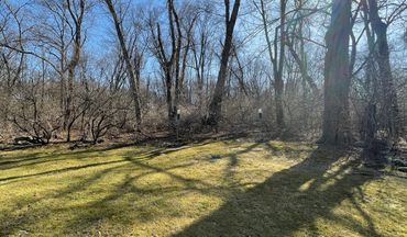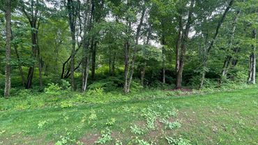 BEFORE: We visited in early spring to get a view of the neighbor's property that needed to be screened out. The client had already planted some evergreens years ago, but they weren't enough. This field was full of multiflora rose and other invasives and bramble that needed to be stripped out, and we planned the amount of large arborvitaes we would need to create a proper screen.