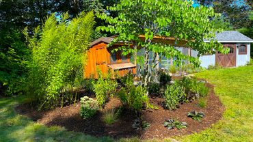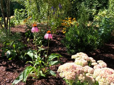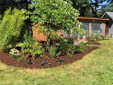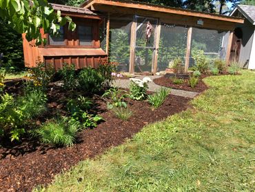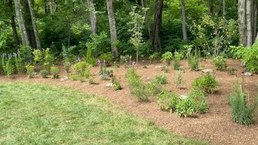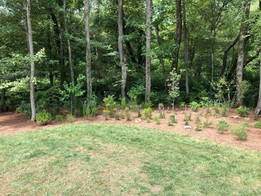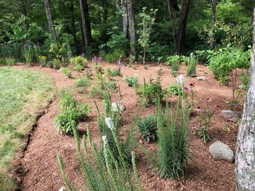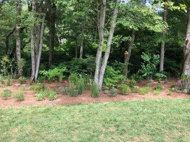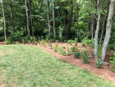 -Three island beds were created in the front lawn by removing the grass and planting with a beautiful 16' tall Heritage birch with gorgeous peeling bark, a weeping redbud, and added a large and numerous variety of mostly native shrubs and perennials (about 90%).
