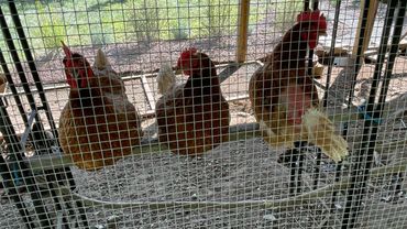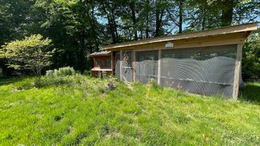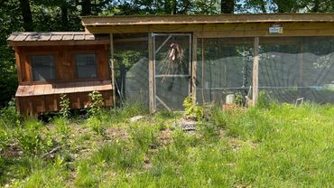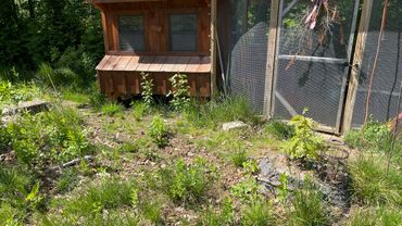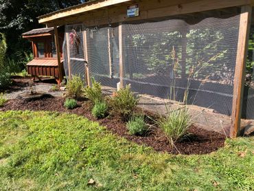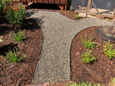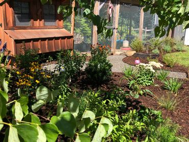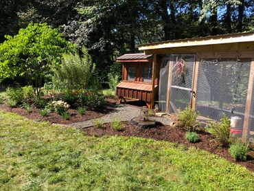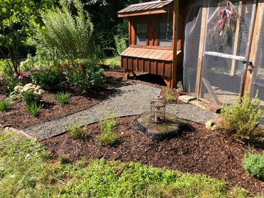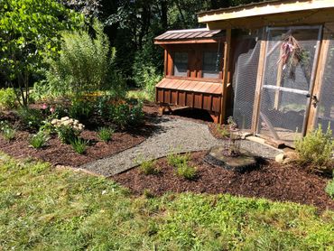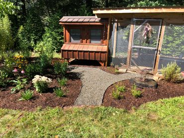 Next, we installed black aluminum edging and created a pebble walkway from the lawn through the bed and to the coup.
