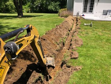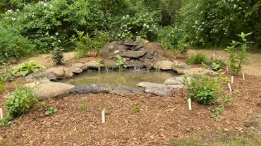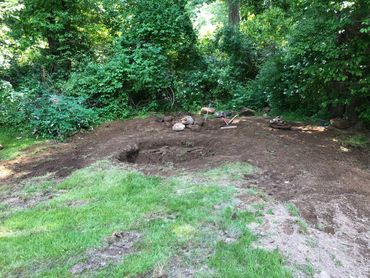 6'x6'x24" deep custom liner pond with waterfall. This was a fun project that we completed today. First I had to jump on the machine to dig a 30' long x 18" deep trench so the electrician could run a dedicated WR/GFCI line out to the pond to power a submersible pond pump. I then dug out the pond with the machine to get the bulk of the digging work done. We then switched to shovels to shape the pond and create the marginal shelf (a 4-6" deep "shelf" where marginal plants- those that grow in 4" or so of water depth).