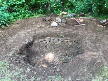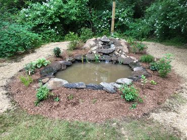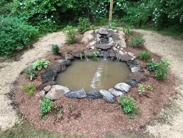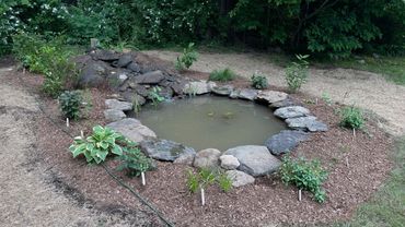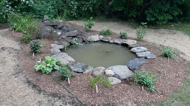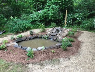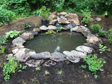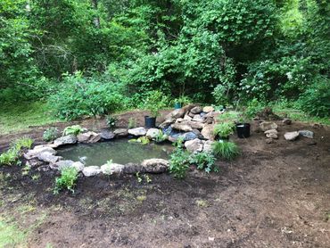 Next, the pond liner went over it all. Rocks we foraged from surrounding woods and from the dig-out were used to surround the pond. The pond was then filled.